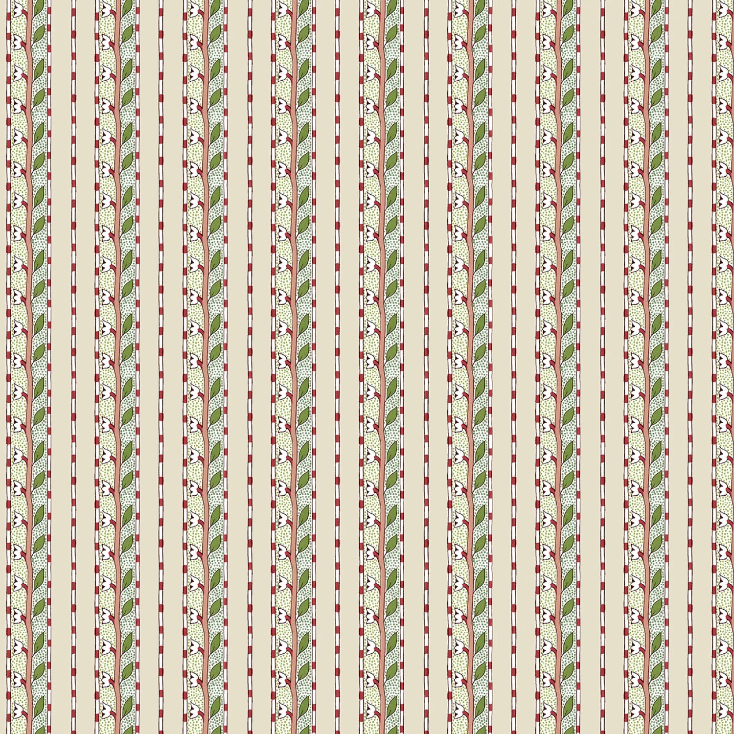 This elegant fabric features a delicate stripe pattern adorned with small daffodil flowers and leaves, creating a charming and classic look. The design is set against a soft ivory background, with vertical stripes in varying shades of green, red, and white, providing a subtle yet sophisticated aesthetic suitable for various crafting and apparel projects.