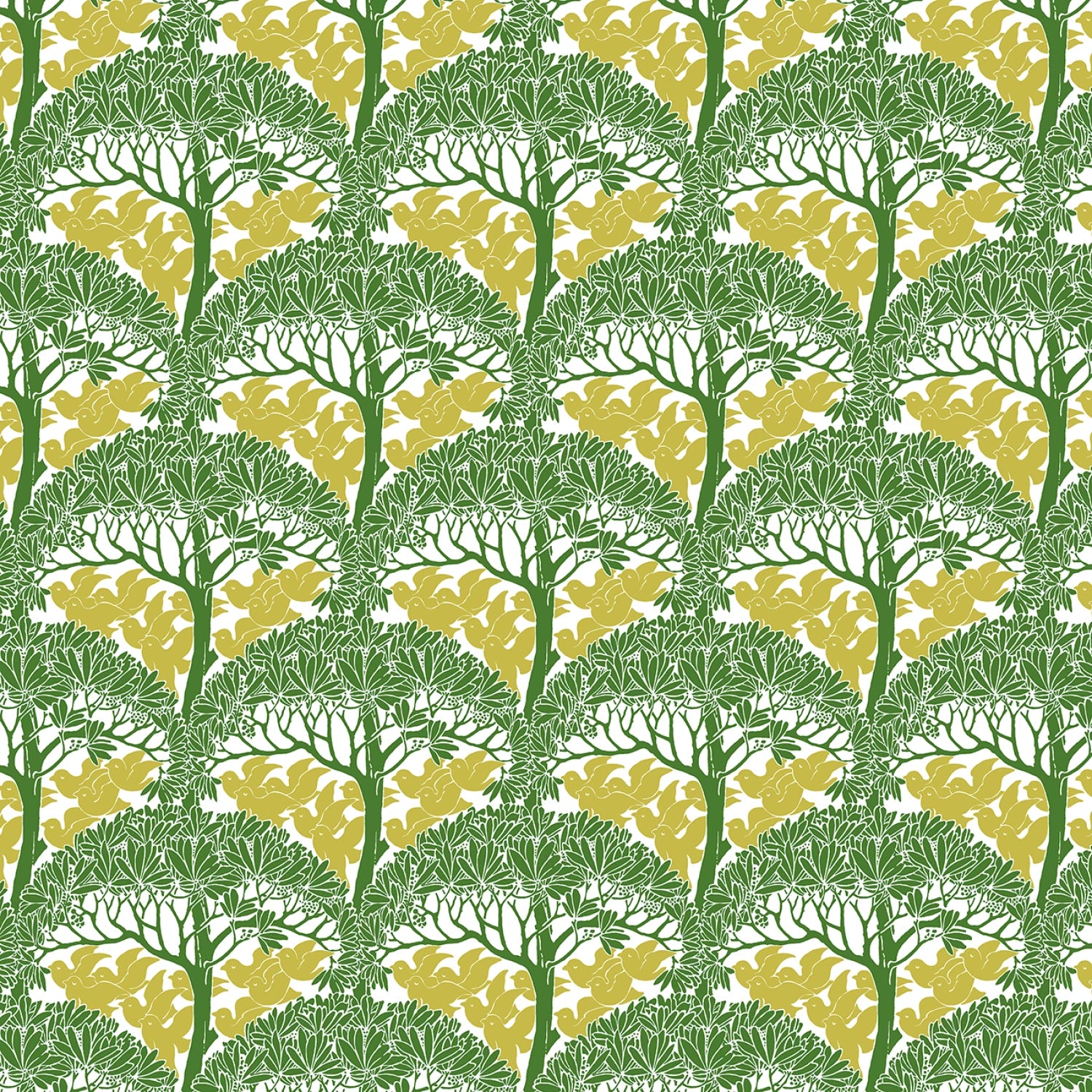 This vibrant fabric features a repeating pattern of stylized trees with lush green foliage and golden-yellow leaves, creating a harmonious and eye-catching design. The trees are arranged in a staggered, arch-like formation, offering a sense of depth and movement.